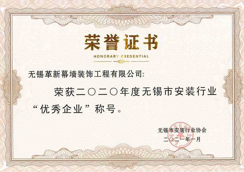 喜訊:熱烈祝賀我公司榮獲2020年度無錫安裝協(xié)會“優(yōu)秀企業(yè)”