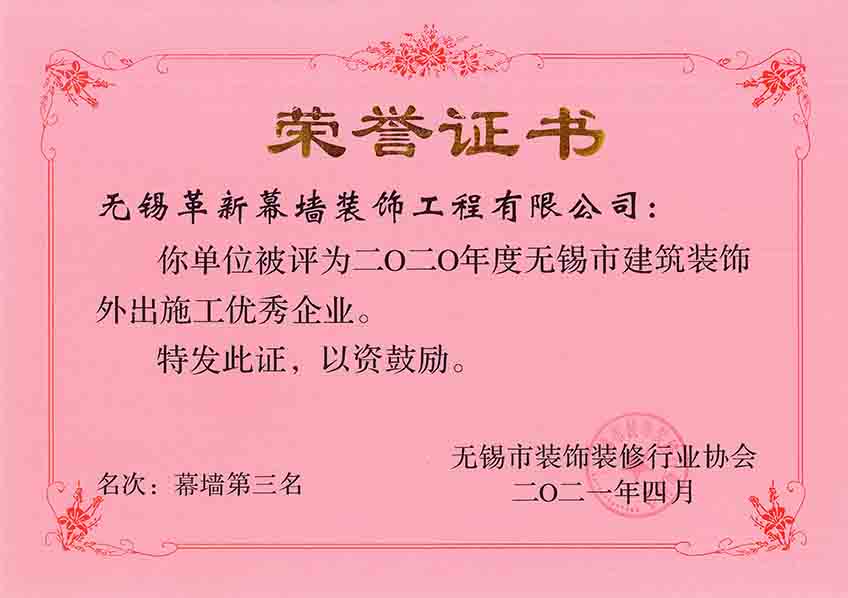 喜訊:熱烈祝賀我公司榮獲2020年度無錫市建筑裝飾“優(yōu)秀企業(yè)”