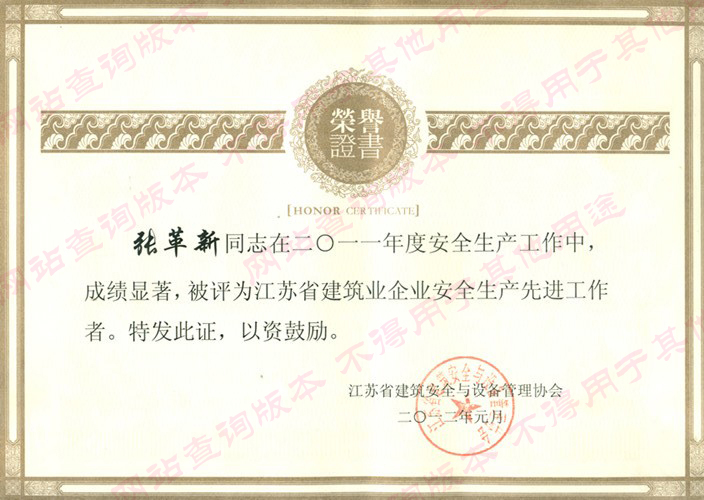 喜訊:熱烈祝賀我公司法定代表人張革新同志獲“2011年江蘇省建筑裝企業(yè)安全生產(chǎn)工作者”稱號