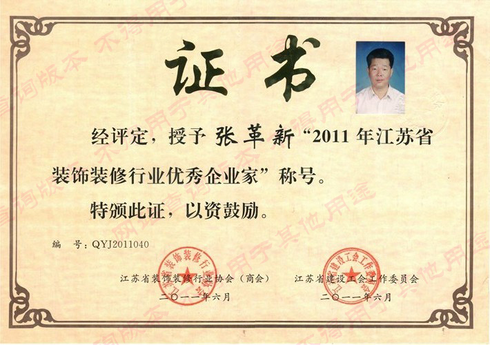 喜訊:熱烈祝賀我公司法定代表人張革新同志獲“2011年江蘇省建裝飾裝修行會優(yōu)秀企業(yè)家”稱號
