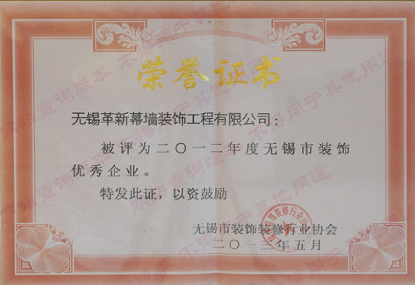 喜訊:熱烈祝賀我公司被評(píng)為2012年度無(wú)錫市裝飾優(yōu)秀企業(yè)