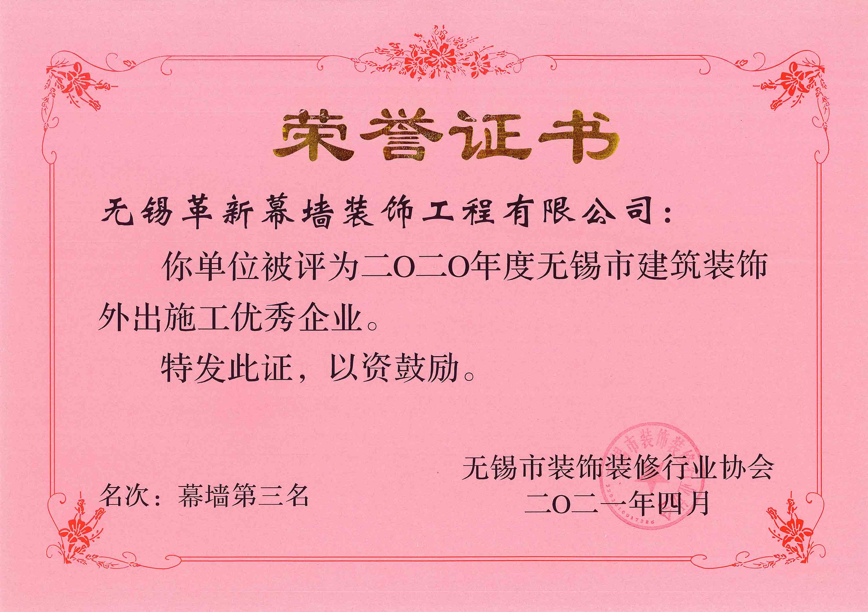 喜訊:熱烈祝賀我公司榮獲2020年度無(wú)錫市建筑外出施工優(yōu)秀企業(yè)