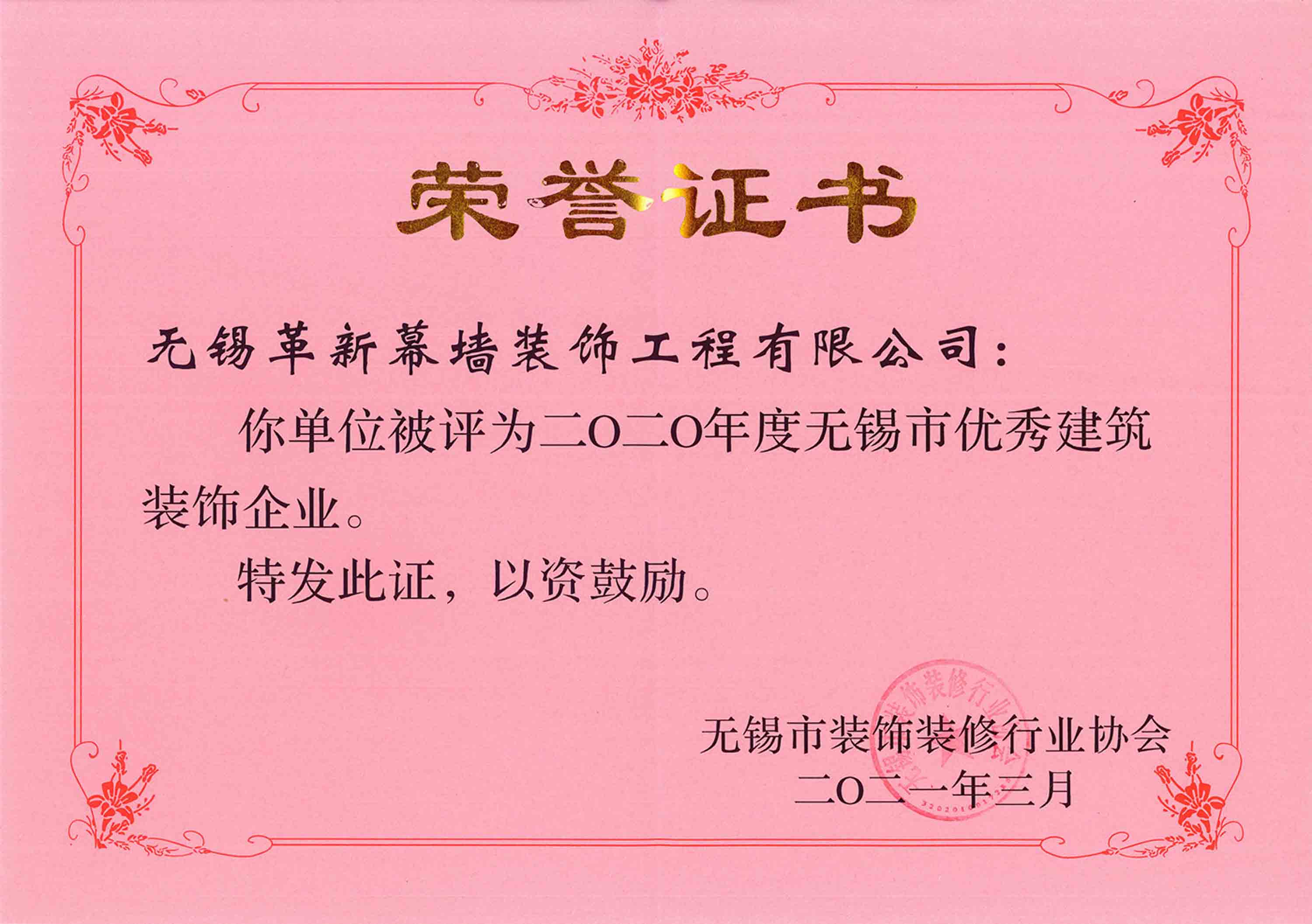 喜訊:熱烈祝賀我公司榮獲2020年度無錫市建筑裝飾“優(yōu)秀企業(yè)”